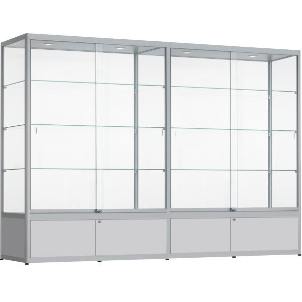 Deze vitrine is uitgevoerd met een onderkast (slot optioneel) van 42cm hoog en wordt altijd in dezelfde kleur als de kast uitgevoerd. De binnenruimte die u heeft is afhankelijk van het model maar zit altijd tussen de 30 en 33cm. De deuren zijn van trespa/volkern.